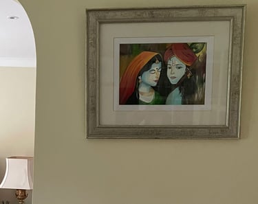 I fell in love with the colourful hues of Abha’s Krishna. Both the paintings contrast different moods and shades of Krishna with peace and serenity in the Radha Krishna painting.